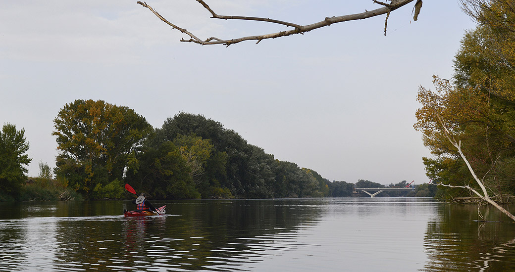 Tras dejar atrás las últimas casas y pasar por debajo de un viaducto continuamos remando en agua plana unos tres kilómetros. Llegamos ahora al primero de tres azudes que encontraremos en los próximos 3 kilómetros, todos ellos navegables. En el Km 14 pasamos bajo la localidad de Carrascal situada en un alto en orilla izquierda y en otros 4 kilómetros de agua plana llegaremos a la presa de San Román, situada al comienzo de una herradura de unos 10 kilómetros, que deriva parte del agua a través de un túnel que atraviesa la montaña hacia el oeste.