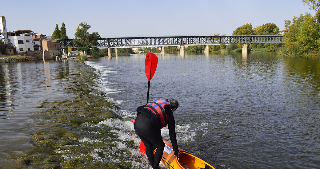 KM 9–10–12. Encontramos 3 azudes de similares características. Los tres presentan una discontinuidad por la rotura del azud que los hacen navegables generando rápidos de nivel 3-3+ en todos ellos. Todos pueden portearse por encima del mismo azud con caudales como el de referencia. Con caudales elevados evaluar y porteo por lado izquierdo en los azudes del km 9 y km 10 y por el lado derecho el del km 12. En ninguno de ellos existe un desembarque claro.